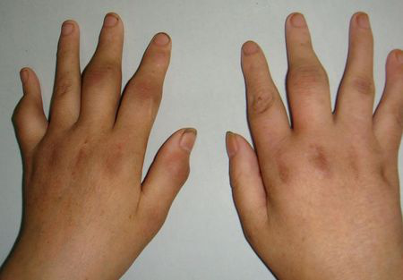 (3) 晨僵 95%以上的患者有关节晨僵。晨僵是指病变关节在夜间静止不动后,晨起时出现较长时间的受累关节僵硬和活动受限。晨僵常是关节受累的个症状,大多出现在关节疼痛之前,病情严重时全身关节均可出现僵硬感。起床后经活动或温暖后晨僵症状可减轻或消失。晨僵常伴有肢端或指(趾)发冷和麻木感。