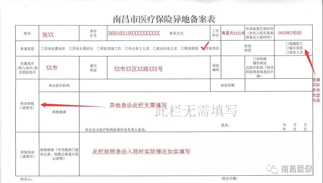 参保人员因出差、旅游、探亲等在异地突发疾病需急诊急救住院时,可委托他人或通过邮箱、传真等方式,将《南昌市医疗保险异地备案表》报送至我市参保地医保经办机构,申请异地急诊备案。
