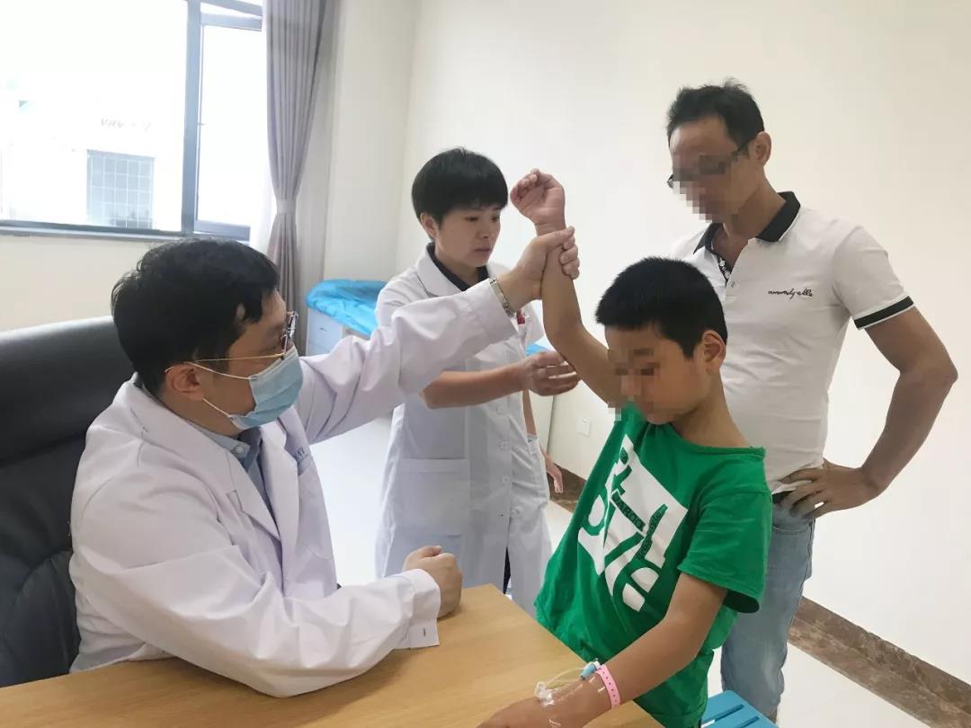 来自萍乡市患者黄某出生时即发现右上肢活动功能障碍,右肩、肘、腕均不能活动,一直没有进行治疗。随着患者长大,右肩仍不能像正常孩子一样旋转,且有畸形。这次孩子家长听到江西省医学科学院附属嘉佑曙光骨科医院安排徐雷教授看诊,马上预约徐教授专家号,提前一天就做好相应的检查。徐雷教授在看过黄某的检查报告后,确诊为“右产瘫”,为其安排下午手术,行“右肩外展功能重建术”。